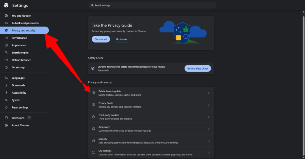 - Navigate to Settings > Privacy and security > Delete browsing data