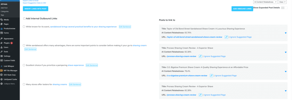- The plugin surfaces link opportunities you would never find manually, especially on sites with 200+ posts