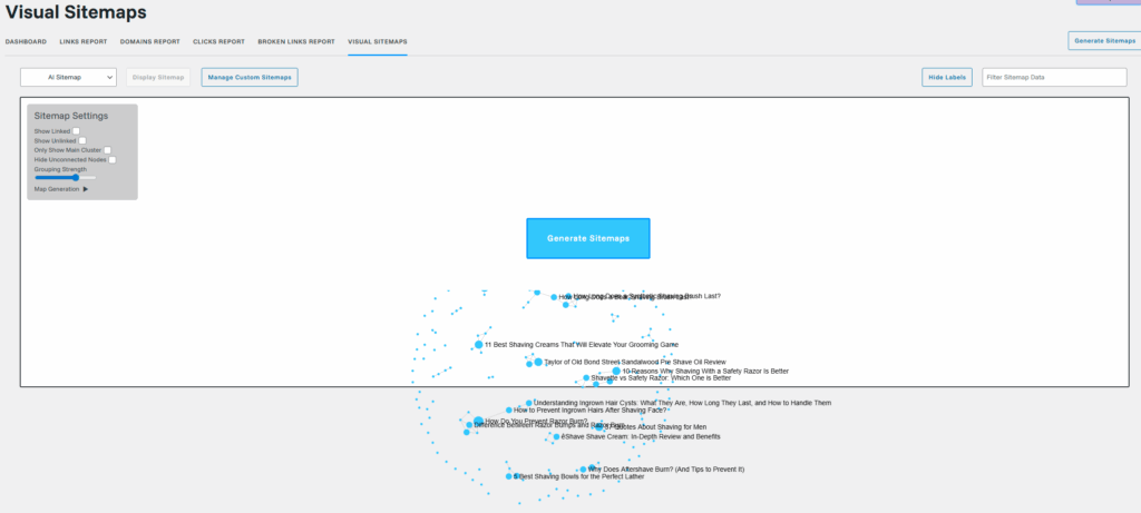 Visual Sitemaps display how your pages connect through internal links in a visual format. The feature proves useful when you identify isolated content clusters or pages with disproportionate link distribution.